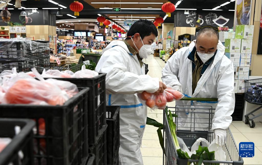 12月29日凌晨,在西安曲江新区一家超市内,工作人员分装即将配送的免费生活物资。新华社记者 刘潇 摄