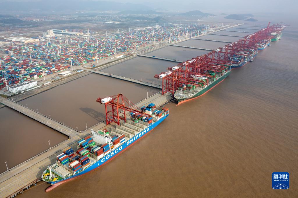 浙江宁波舟山港梅山港区集装箱码头一派繁忙(12月17日摄,无人机照片)。新华社发(蒋晓东 摄)