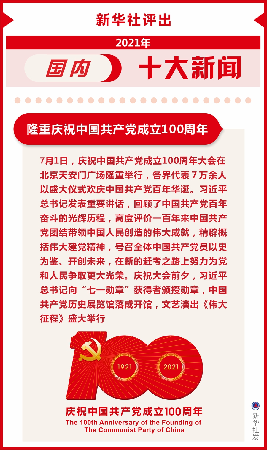 7月1日,庆祝中国共产党成立100周年大会在北京天安门广场隆重举行,各界代表7万余人以盛大仪式欢庆中国共产党百年华诞。习近平总书记发表重要讲话,回顾了中国共产党百年奋斗的光辉历程,高度评价一百年来中国共产党团结带领中国人民创造的伟大成就,精辟概括伟大建党精神,号召全体中国共产党员以史为鉴、开创未来,在新的赶考之路上努力为党和人民争取更大光荣。庆祝大会前夕,习近平总书记向“七一勋章”获得者颁授勋章,中国共产党历史展览馆落成开馆,文艺演出《伟大征程》盛大举行。