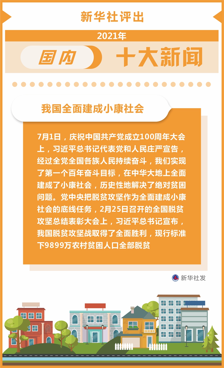 7月1日,庆祝中国共产党成立100周年大会上,习近平总书记代表党和人民庄严宣告,经过全党全国各族人民持续奋斗,我们实现了第一个百年奋斗目标,在中华大地上全面建成了小康社会,历史性地解决了绝对贫困问题。党中央把脱贫攻坚作为全面建成小康社会的底线任务,2月25日召开的全国脱贫攻坚总结表彰大会上,习近平总书记宣布,我国脱贫攻坚战取得了全面胜利,现行标准下9899万农村贫困人口全部脱贫。