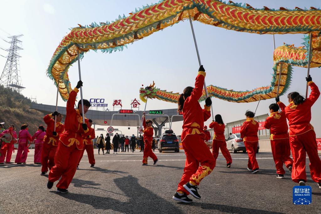 12月29日,人们舞龙庆祝舟岱大桥正式通车。
