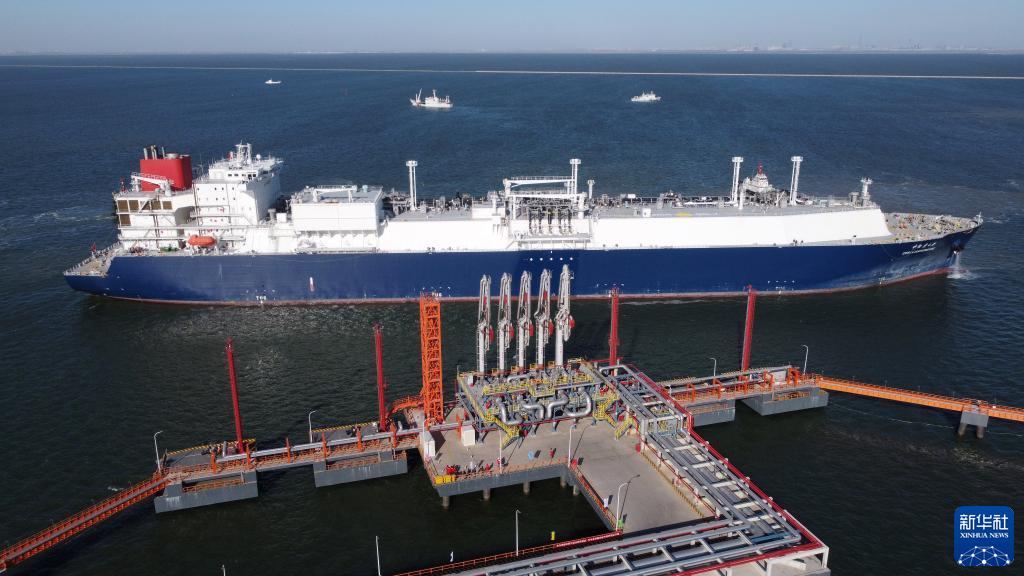 12月29日,一艘LNG运输船靠泊中国石化天津LNG接收站“2号泊位”(无人机照片)。新华社记者 赵子硕 摄