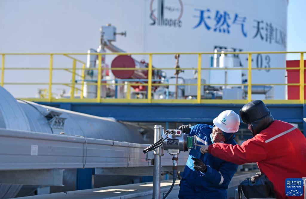 12月29日,工作人员在中国石化天津LNG接收站“2号泊位”上检查输气管道参数。新华社记者 赵子硕 摄