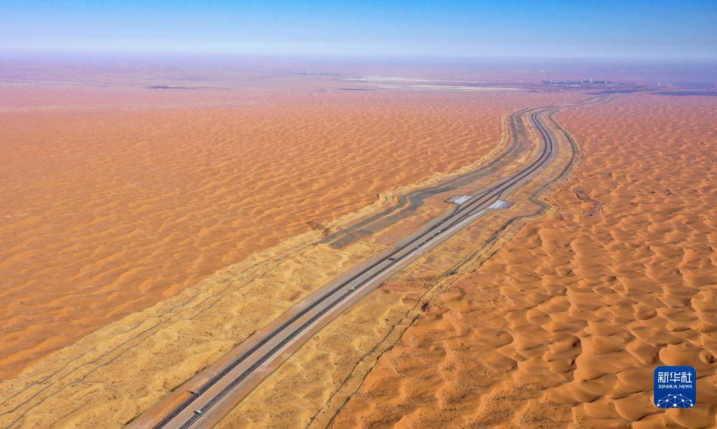 乌玛高速青铜峡至中卫段穿越腾格里沙漠的路段(12月29日摄,无人机照片)。