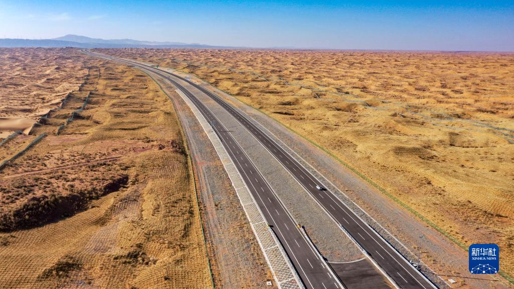 12月29日,车辆行驶在乌玛高速青铜峡至中卫段穿越腾格里沙漠的路段上(无人机照片)。