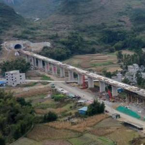 当日,在位于广西都安瑶族自治县永安镇境内的贵南高铁建设现场,工人抓紧施工,建设工地一片繁忙火热场面。
