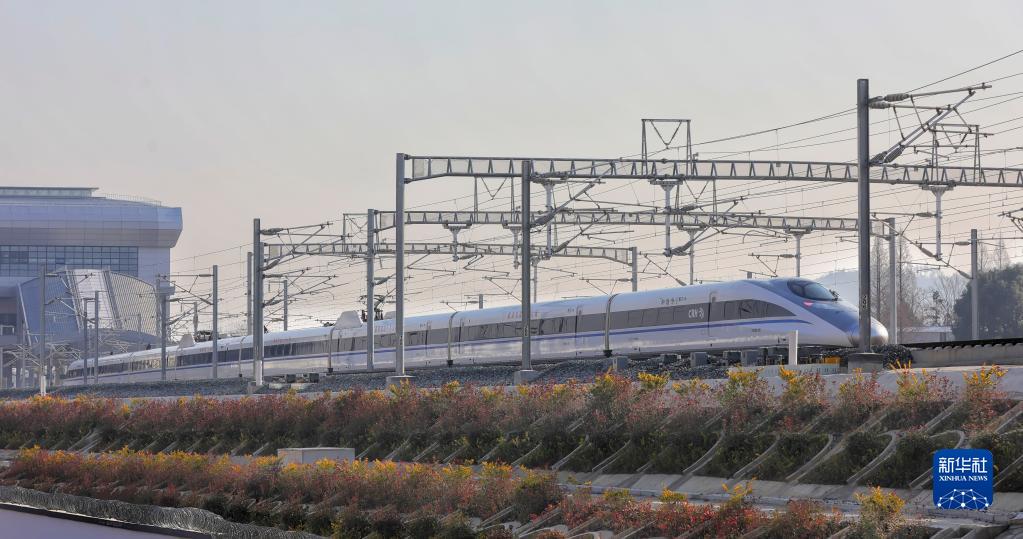 12月30日,一列高铁列车行驶在安徽怀宁县境内。