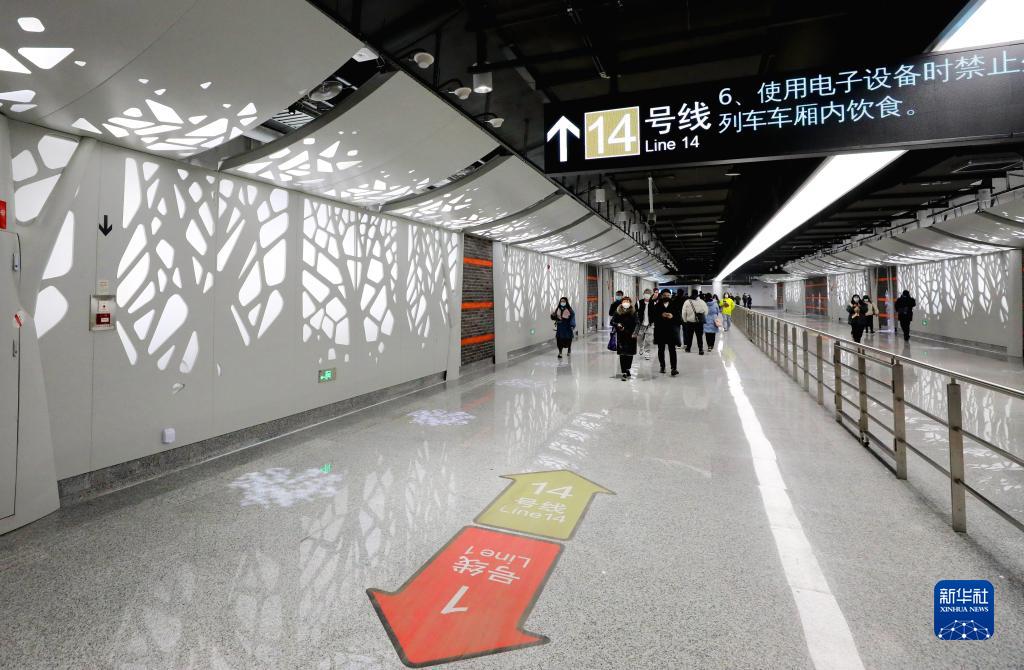 12月30日,乘客行走在轨交1号线和14号线一大会址·黄陂南路站换乘通道内。