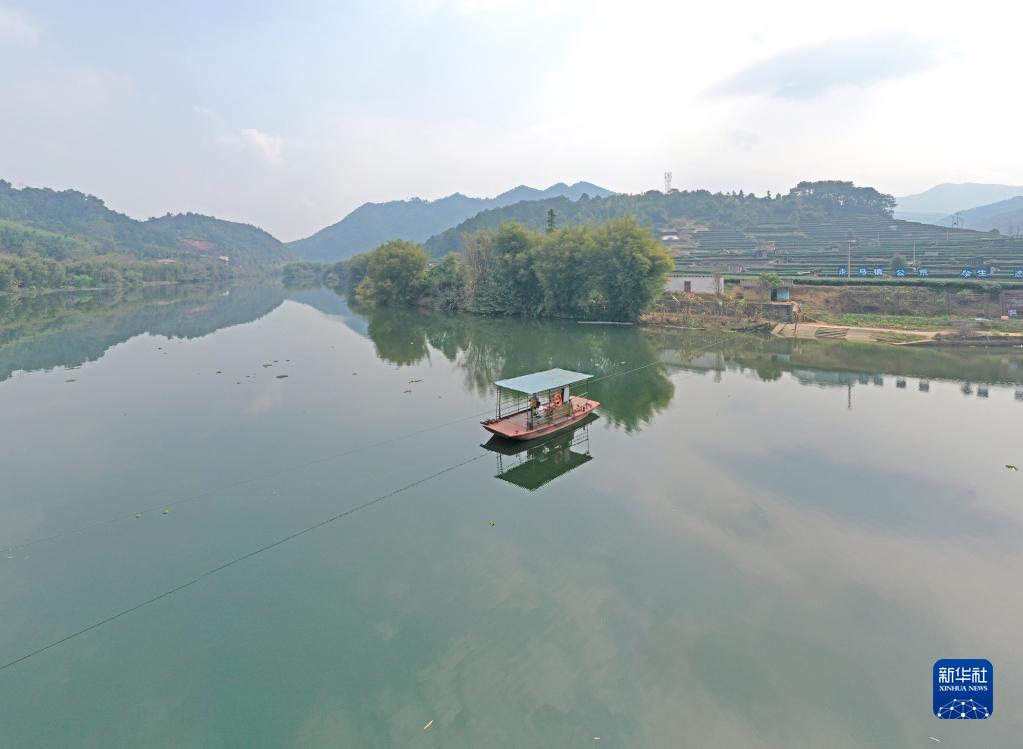 一艘渡船行驶在广西昭平县清澈的桂江上(2月24日摄,无人机照片)。