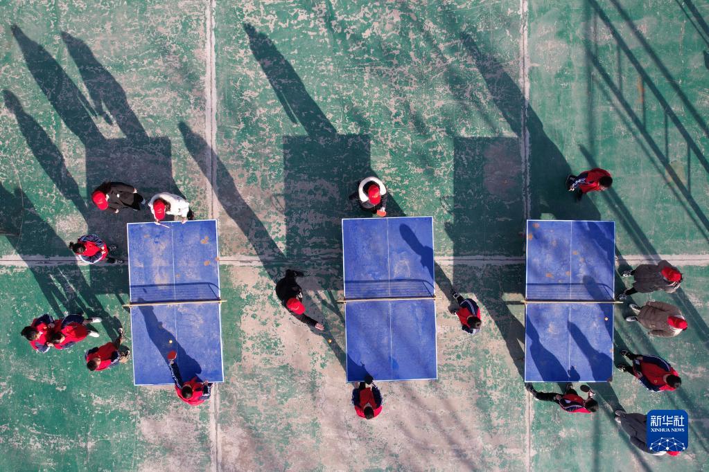 12月30日,任泽区的志愿者和圣水路小学学生玩乒乓球(无人机照片)。