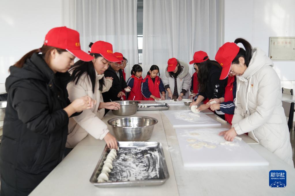 12月30日,任泽区的志愿者和圣水路小学学生一起包饺子。