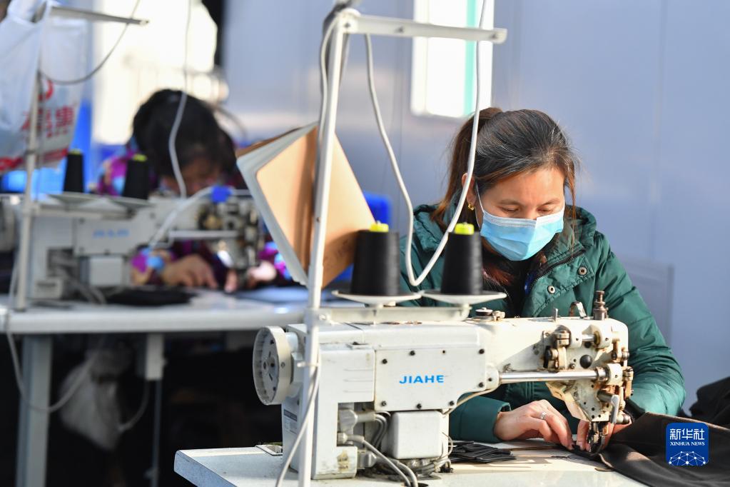在洪家塅安居小区,居民邹红桃(右)在扶贫车间工作(12月29日摄)。