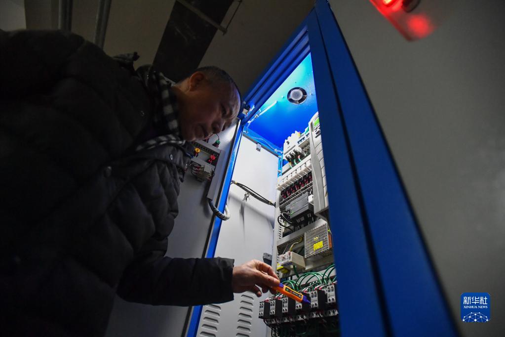 在洪家塅安居小区,居民李梅山在检查配电设备。李梅山参加了社区组织的电工技能培训,考取电工证后上岗(12月29日摄)。