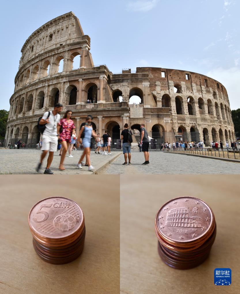 拼版照片:上图为2021年8月4日,游客参观意大利罗马斗兽场;下左图为2021年12月30日在意大利罗马拍摄的由意大利发行的5欧分硬币正面;下右图为2021年12月30日在意大利罗马拍摄的由意大利发行的5欧分硬币,背面印有斗兽场图案。