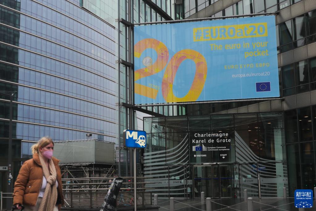 2021年12月30日,在比利时布鲁塞尔,一名女子经过欧盟机构展示出的纪念欧元流通20周年的海报。