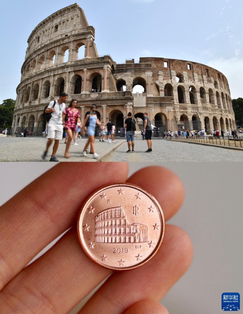 拼版照片:上图为2021年8月4日,游客参观意大利罗马斗兽场;下图为2021年12月30日在意大利罗马拍摄的由意大利发行的5欧分硬币,背面印有斗兽场图案。