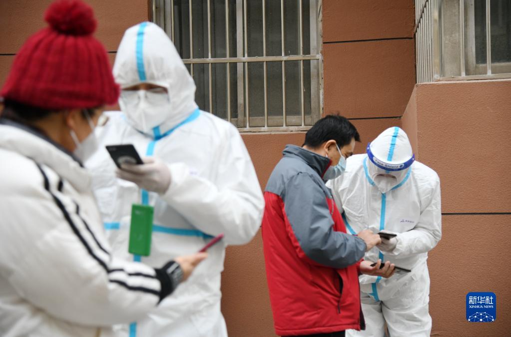 12月30日,在西安市碑林区祥和花园,外卖骑手志愿者王依凡(右一)、李鹏(右三)协助医护人员进行核酸采样身份核验。
