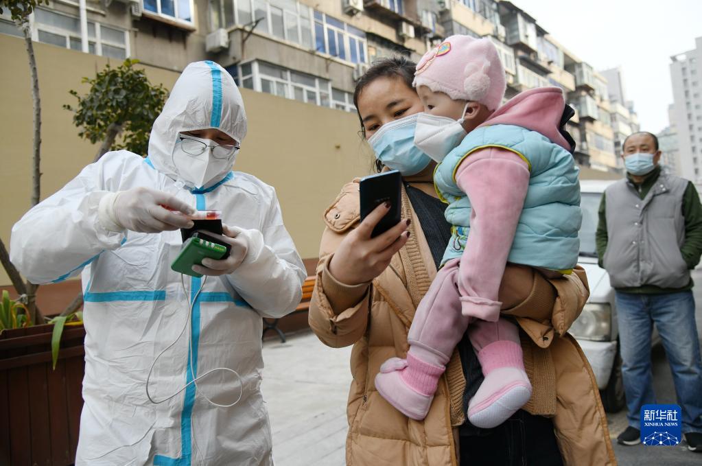 12月30日,在西安市碑林区祥和花园,外卖骑手志愿者李鹏(左一)协助医护人员进行核酸采样身份核验。