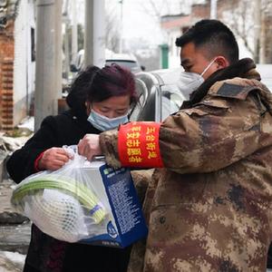 12月30日,西安市长安区五台街道办事处主任伍媛媛(右)向东甘村志愿者了解村民食品需求情况。