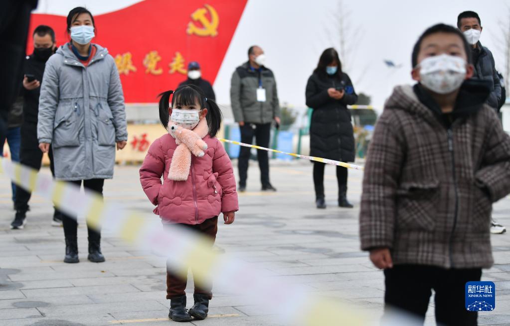 12月30日,西安市长安区五台街道石砭峪新村的村民排队进行核酸检测。