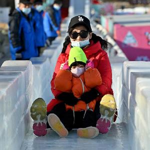 12月31日,游客在陶然亭公园的冰雪嘉年华活动上的冰迷宫中游玩。