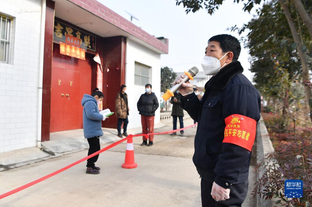 12月30日,在西安市长安区五台街道东甘村,志愿者(右)向村民宣传核酸检测注意事项。