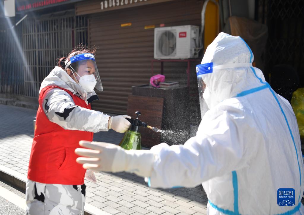 12月29日,西安市碑林区南院门蒲公英志愿者服务站的志愿者(左)在碑林区一处核酸检测点协助医护人员进行消毒。