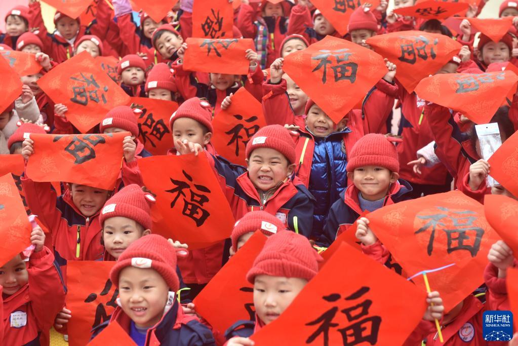 12月31日,四川内江高新区第一幼儿园的小朋友在迎新年逛庙会主题活动上展示领取的福字。新华社发(黄正华摄)