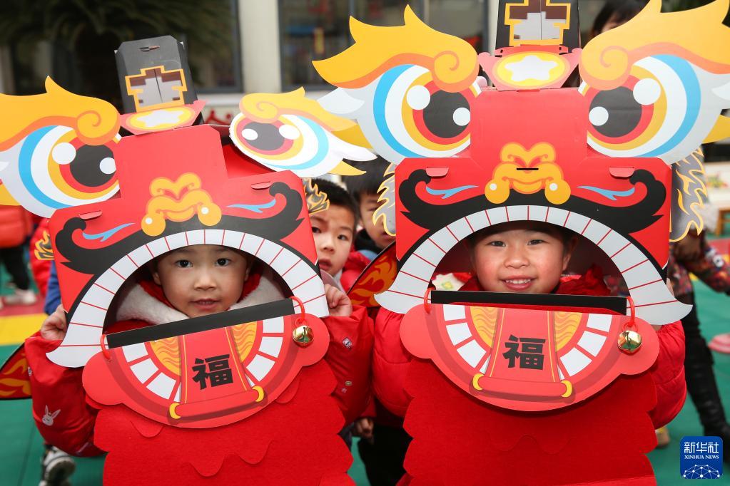 12月31日,湖北省襄阳市襄城教工幼儿园的小朋友参与舞狮游戏。新华社发(杨东摄)