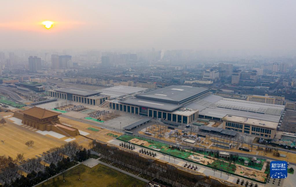 12月31日拍摄的西安火车站北站房与大明宫丹凤门广场远景(无人机照片)。