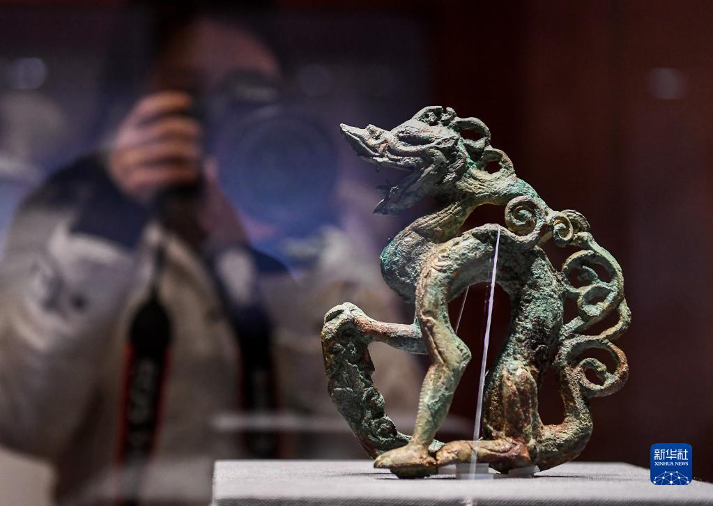 太子城遗址出土的铜坐龙在展览中亮相(12月31日摄)。