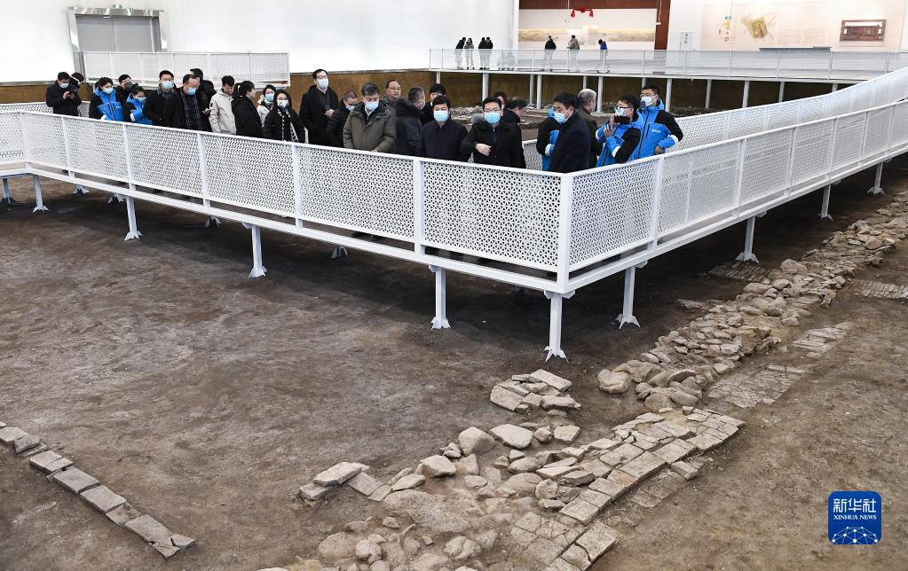 12月31日,参观者穿行在太子城遗址公园西院落展厅的步道上观看考古遗址。
