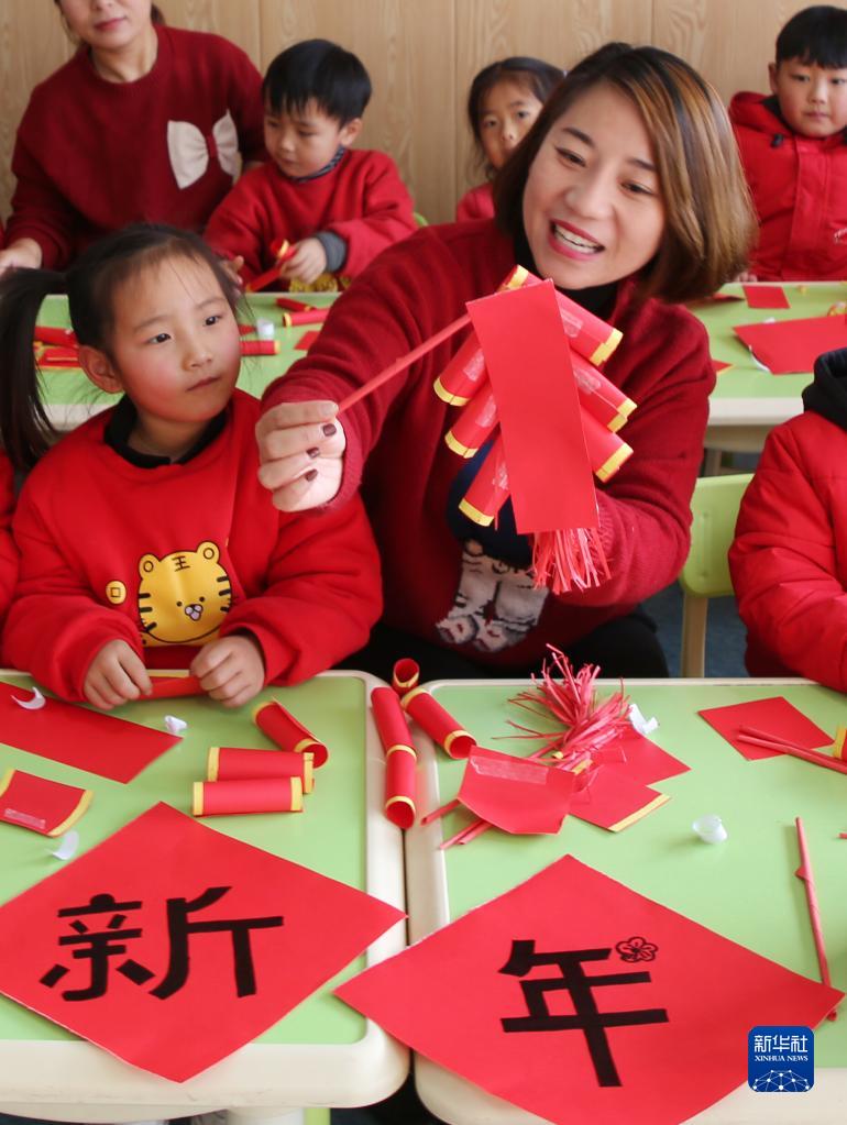 12月31日,山东省临沂市郯城县郯城街道官塘幼儿园的老师带领孩子们制作手工作品迎接新年。