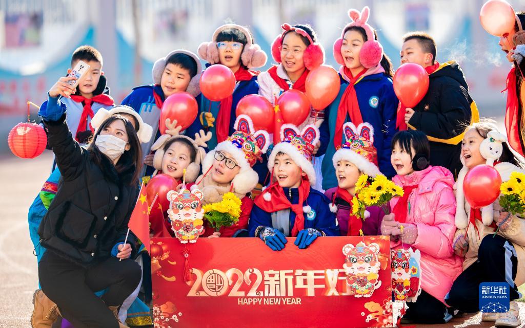 12月31日,内蒙古呼和浩特市玉泉区南柴火市街小学学生手持“2022新年好”字样和老师合影。