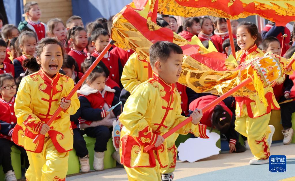 12月31日,浙江省湖州市德清县浙江工业大学附属秋山幼儿园的孩子舞龙迎新年。