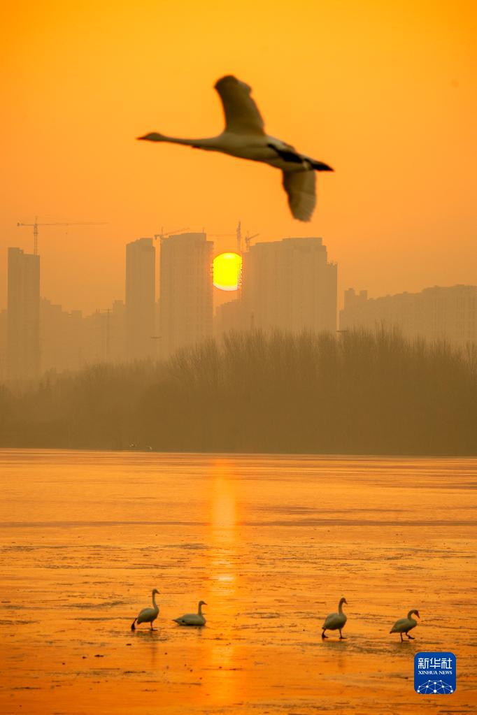 2022年1月1日在河南三门峡天鹅湖国家城市湿地公园拍摄的新年初升的太阳。