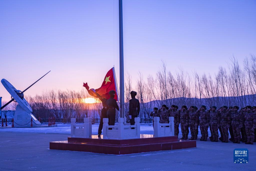 2022年1月1日,驻守在祖国陆地版图最东端的北部战区陆军某边防旅东极哨所官兵迎着新年第一缕曙光升起五星红旗。