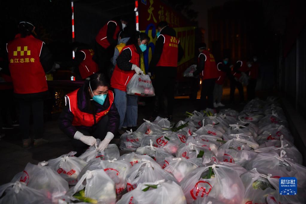 2021年12月31日,在西安曲江风景线小区,志愿者分拣免费生活物资。