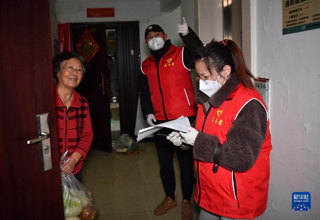 2021年12月31日,在西安曲江风景线小区,志愿者上门配送免费生活物资。