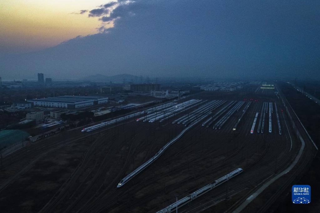 当日是2022年第一天,朝阳升起,万象更新。几十组动车经过武汉动车段工作人员通宵检修后,在黎明时分陆续驶出,迎接新一天的旅客。