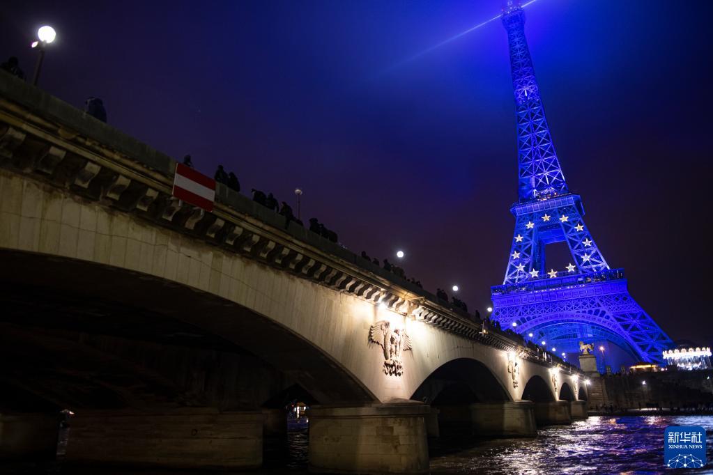 2021年12月31日,法国巴黎地标性建筑埃菲尔铁塔点亮欧盟旗帜图案的灯光。