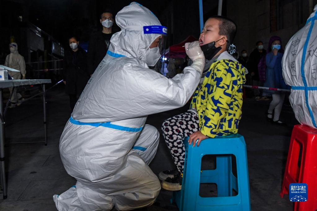 2021年12月31日凌晨2时10分,在东兴市连夜开展的第六轮大规模核酸筛查中,医务人员为小朋友做咽拭子采样。