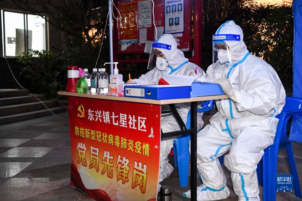 2022年1月1日1时46分,在东兴市一处封闭小区外,医务人员在值守。