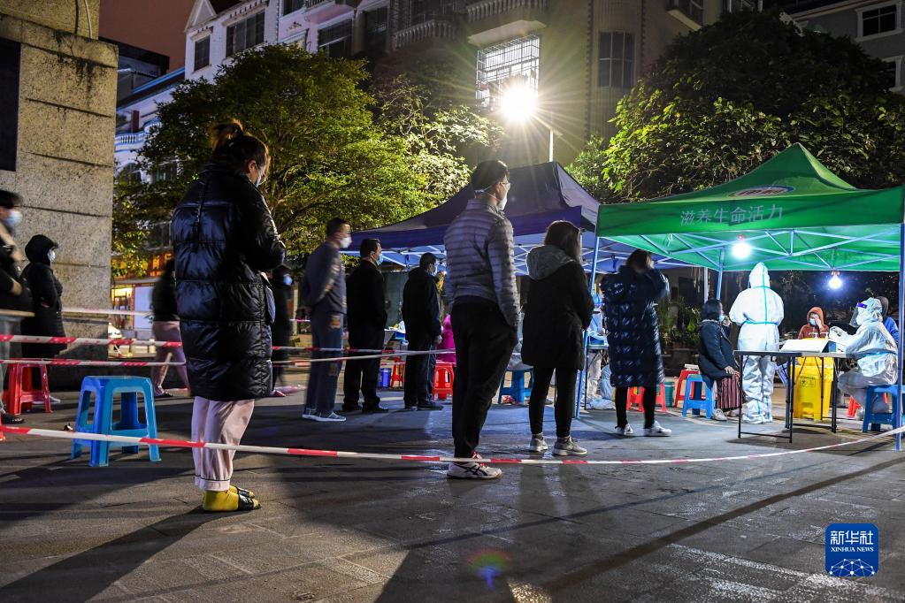 2021年12月31日凌晨2时23分,在东兴市连夜开展的第六轮大规模核酸筛查中,市民有序排队等待做核酸采样。