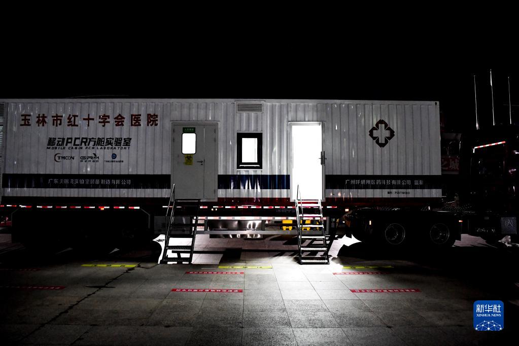 2021年12月31日凌晨3时56分,一辆外地支援东兴市的移动方舱实验室连夜对采集的咽拭子样本进行检测。