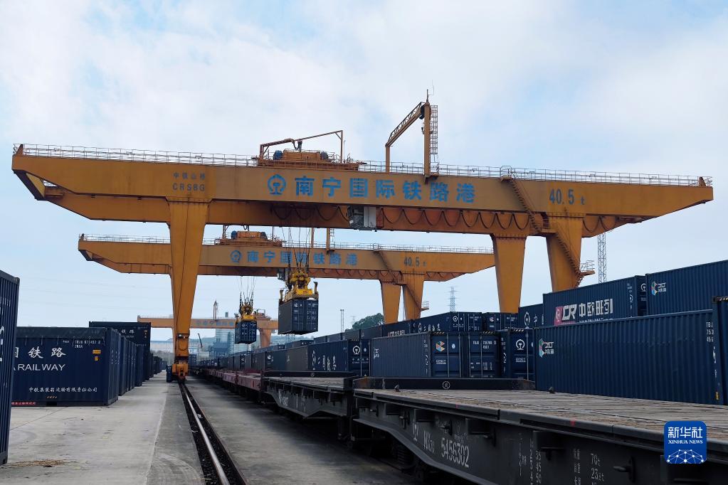 图为南宁国际铁路港国际货运班列集装箱吊装作业现场(2021年12月31日摄)。