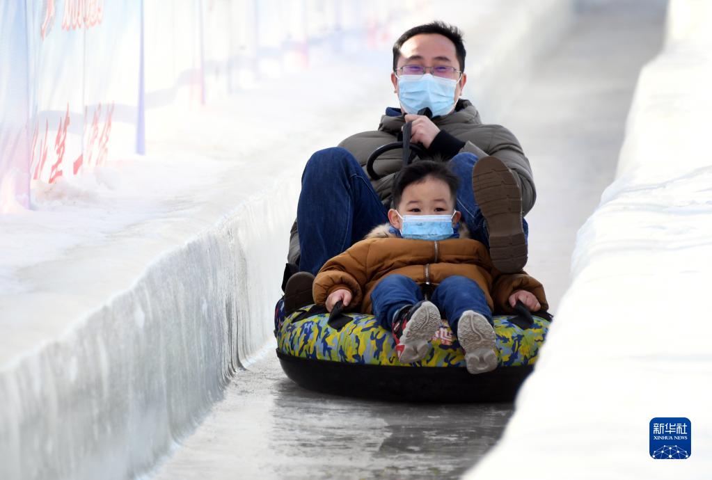 1月1日,游客在第七届北京欢乐水魔方冰雪嘉年华体验冰滑梯。