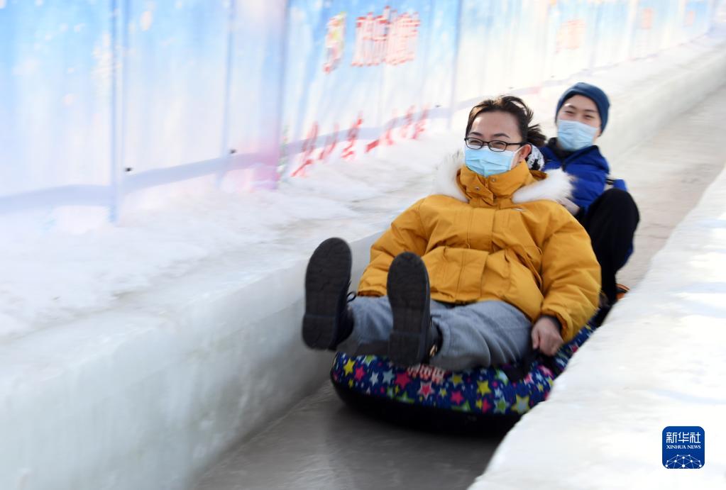 1月1日,游客在第七届北京欢乐水魔方冰雪嘉年华体验冰滑梯。