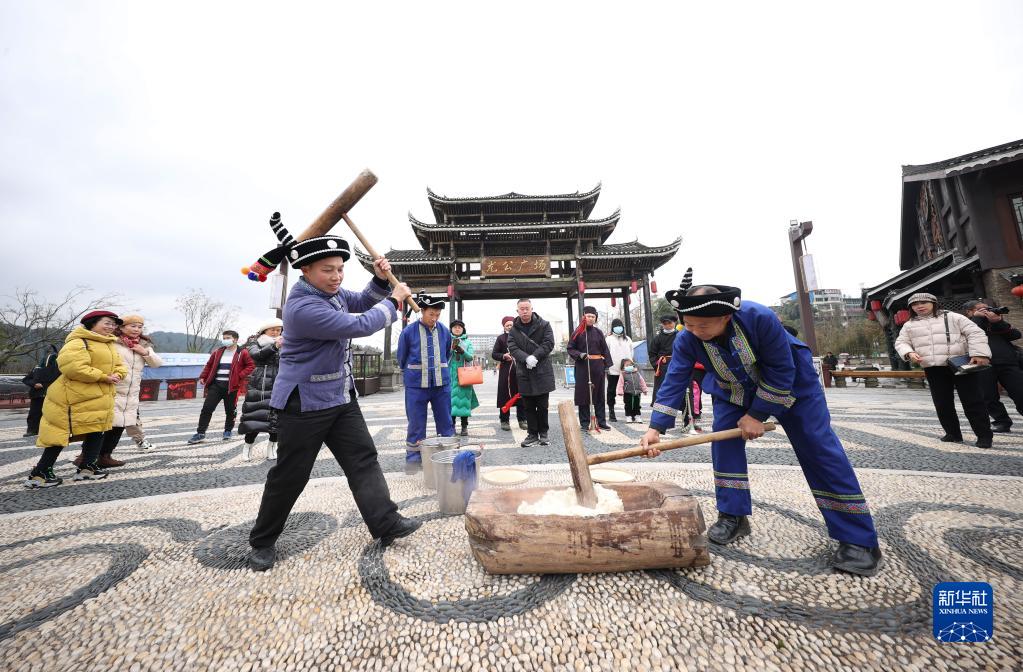 1月1日,游客在贵州省丹寨县万达小镇景区观看传统民俗表演“打粑粑”。