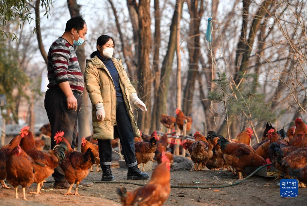 2021年12月31日,王卫花(右)在西安市长安区一户养鸡的农户家了解情况。王卫花是西安市长安区职业农民协会会长、果优特种植专业合作社负责人。本轮疫情发生以来,她积极向农村防疫一线捐赠防疫物资和水果,帮助农户协调解决农产品销路和运输问题,避免农户遭受损失。